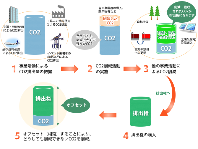 カーボン・オフセットとは、自らの活動(事業活動や生活)から排出される温室効果ガスについて、削減努力を行った上で、どうしても削減できない温室効果ガスを、他の場所で行われた削減・吸収活動によって生み出されたクレジットを購入することにより相殺する取組です。